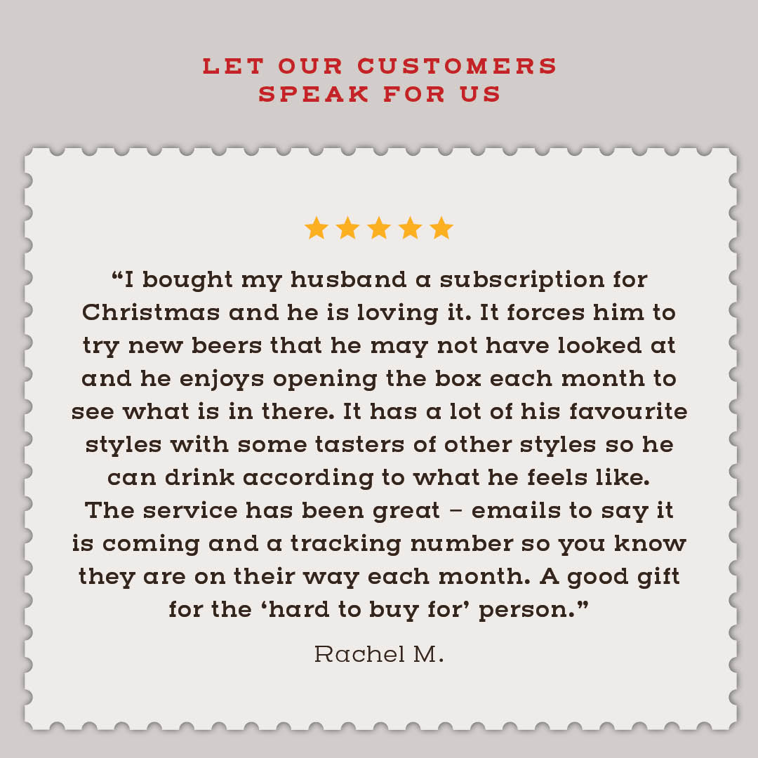 – David G.I bought my husband a subscription for Christmas and he is loving it. It forces him to try new beers that he may not have looked at and he enjoys opening the box each month to see what is in there. It has a lot of his favourite styles with some tasters of other styles so he can drink according to what he feels like. The service has been great – emails to say it is coming and a tracking number so you know they are on their way each month. A good gift for the ‘hard to buy for’ person.